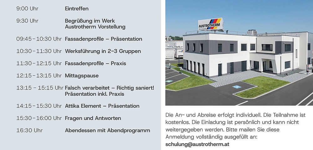 ausführlich besprochen. Und im Anschluss holt man sich bei der Werksführung interessante Einblicke in die nachhaltige Produktion der Austrotherm Dämmstoffe.
